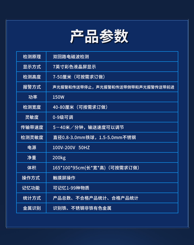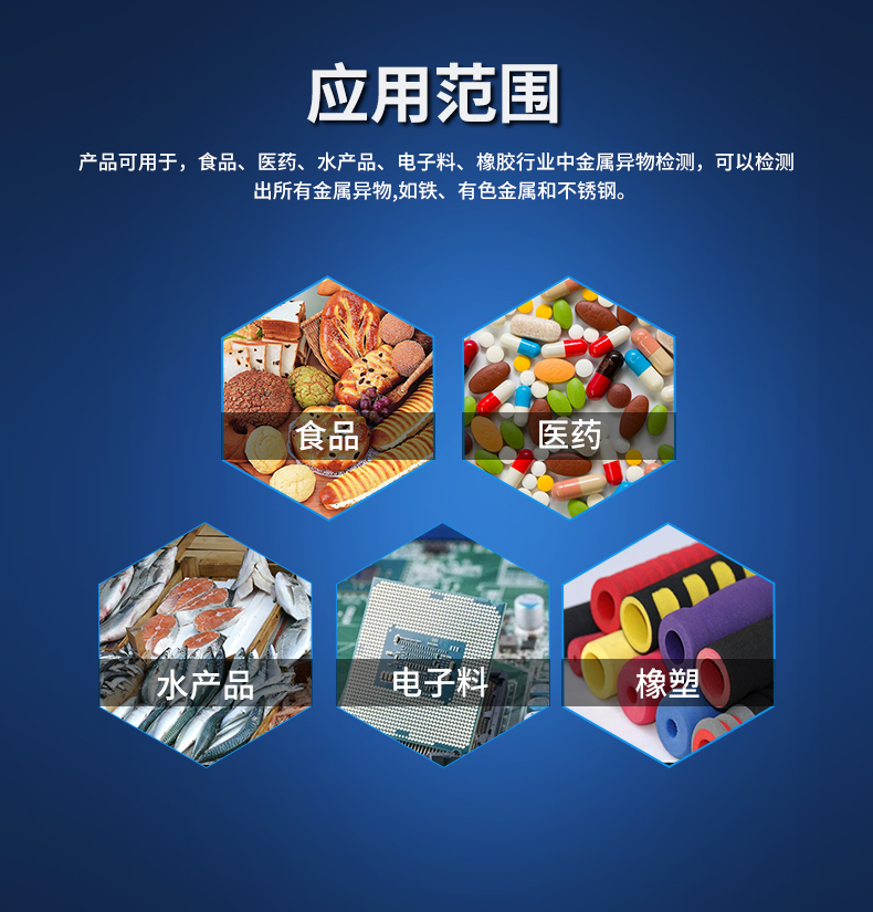 6、檢測靈敏度:直徑0.8-3.0mm鐵球,1.5-5.0mm不銹鋼(探測精度與機器的高度和寬度有直接關系,通常高度越高,寬度越寬,機器的探測精度越低,反之,相反。)