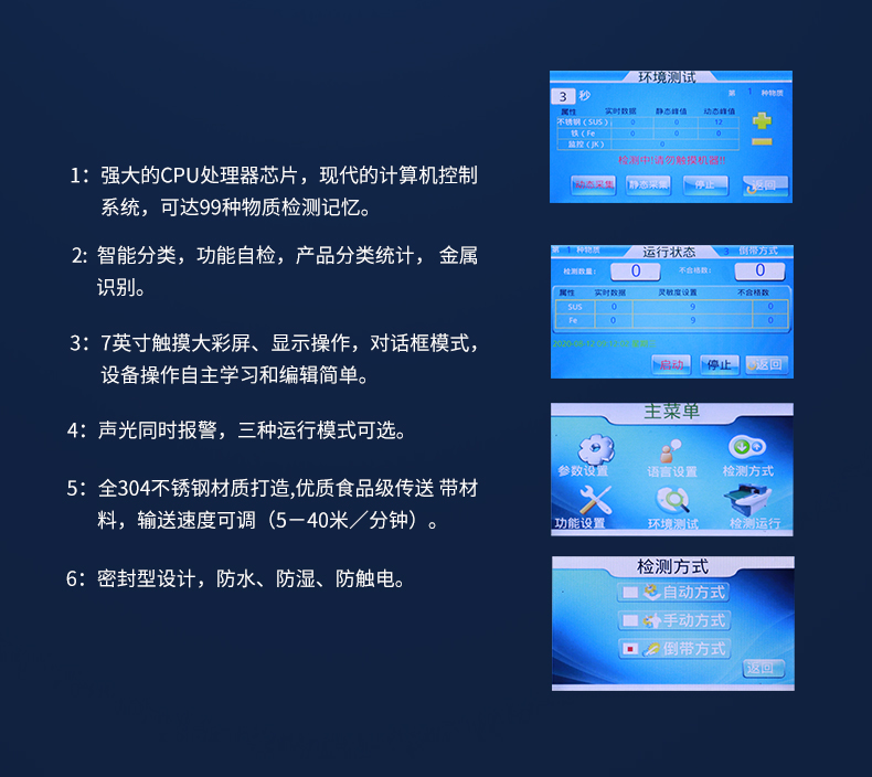 6、檢測到微量金屬時,聲、光、儀表同時報警,不合格產品自動返回到停止狀態和排除裝置控制分離。