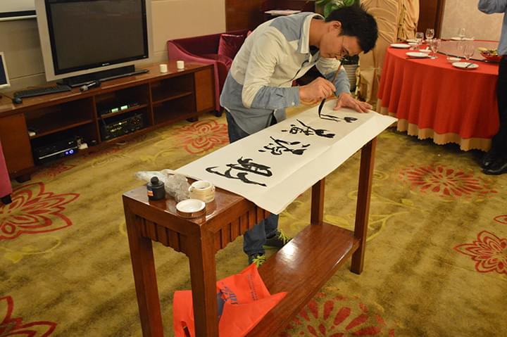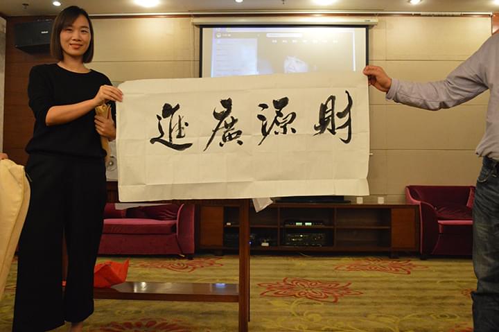 倉庫主管葉紅斌展示毛筆字預祝美創達誠2016:財源廣進
